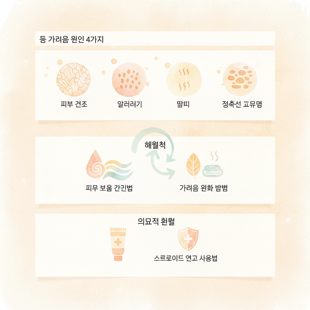 갑자기 등이 이유 없이 간지러울 때, 우리는 무의식적으로 긁게 됩니다. 하지만 긁는 행동은 순간적인 해소를 줄 뿐, 오히려 피부를 손상시키고 가려움을 악화시킬 수 있습니다. 특히 반복되는 등 가려움은 단순한 불편함을 넘어, 우리 몸이 보내는 신호일 수 있습니다. 이 글에서는 등이 간지러운 흔한 4가지 원인을 전문가처럼 진단하고, 각 증상에 맞는 효과적인 해결책과 생활 속 관리 방법을 알려드리겠습니다. 더 이상 무작정 긁기 전에, 올바른 원인 파악과 현명한 대처법을 익혀 보세요.