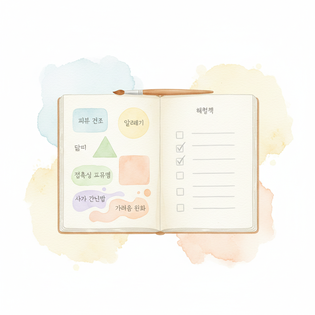 가장 중요한 것은 충분한 보습입니다. 샤워 후에는 반드시 보습제를 충분히 발라주세요. 건조함을 유발하는 뜨거운 물 샤워나 너무 잦은 목욕은 피하고, 미지근한 물로 짧게 샤워하는 것이 좋습니다. 또한, 실내가 너무 건조하지 않도록 가습기를 사용하거나 젖은 수건을 널어 습도를 조절하는 것도 도움이 됩니다. 옷은 피부에 자극이 적은 면 소재를 선택하는 것이 좋습니다.