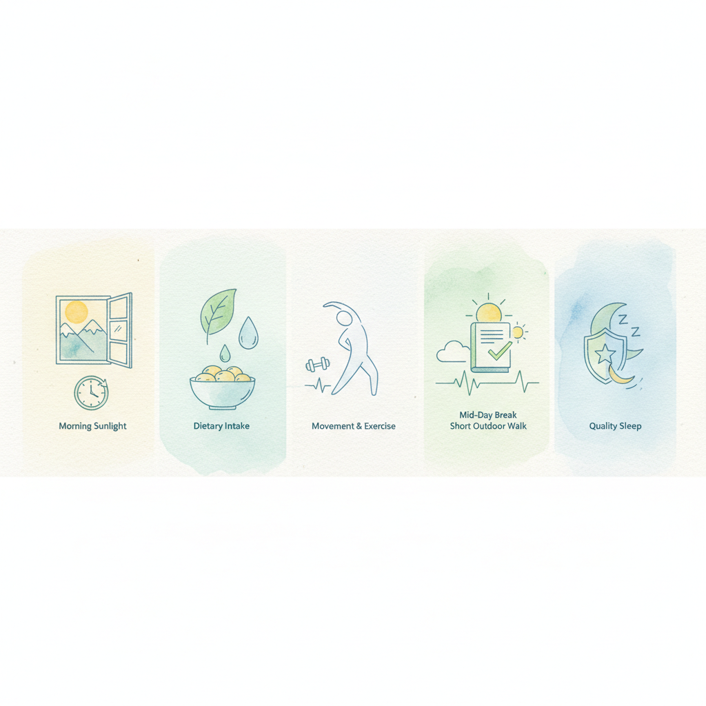 짧은 시간이라도 아침 햇살을 쬐면 생체 리듬을 조절하는 데 도움을 주어 활기찬 하루를 시작할 수 있습니다. 또한, 점심시간에 잠깐이라도 창가에 앉아 있거나, 건물 밖으로 나가 짧은 산책을 하는 것만으로도 비타민D 생성에 기여할 수 있습니다.