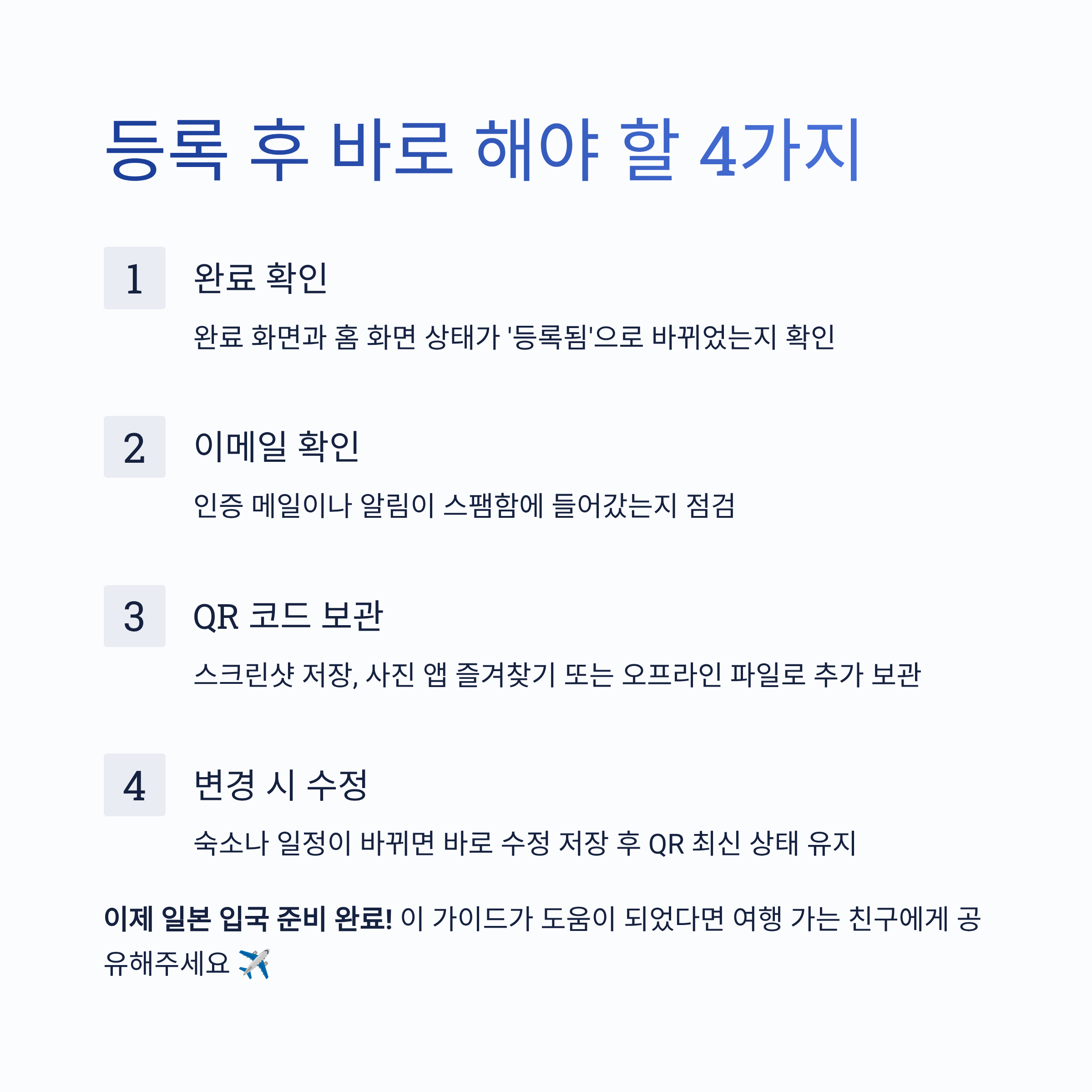 비짓재팬 등록은 어렵다기보다, 한 번에 여러 정보를 입력해야 해서 처음에만 살짝 부담스럽게 느껴질 뿐입니다. 오늘 정리한 순서대로 진행하면 핵심은 딱 세 가지예요. 여권 영문 표기 그대로 입력하기, 숙소 주소를 준비해 두기, 그리고 QR 코드를 안전하게 보관하기. 이 3가지만 지키면 공항에서 종이 작성 때문에 허둥대는 상황을 크게 줄일 수 있습니다.
