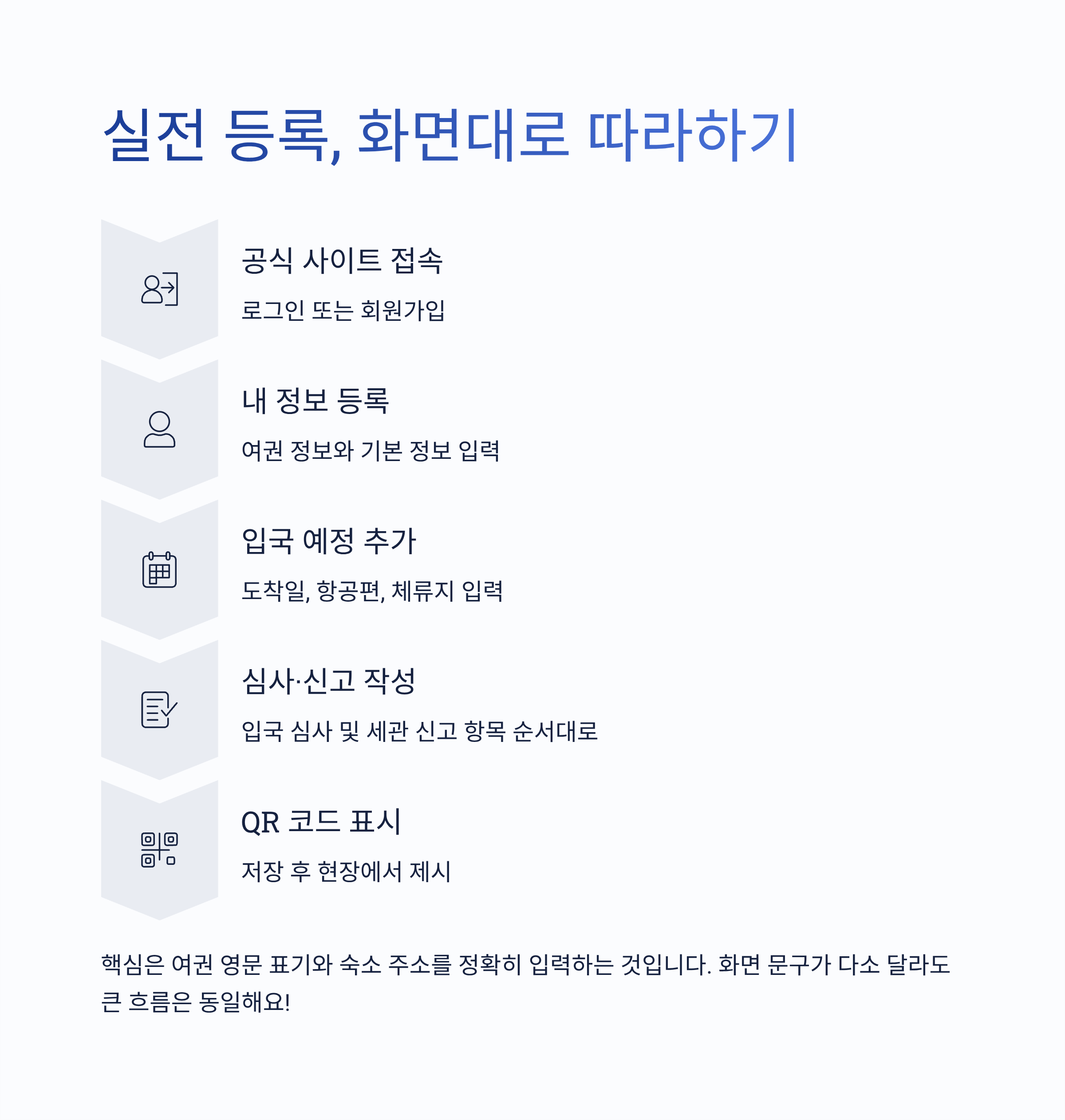 공식 가이드에서도 사용자 등록, 여권 정보, 기본 정보 등록 후 입국 절차 카테고리 등록 등 단계 흐름을 안내하고 있어요. 화면 문구가 다소 달라도 큰 흐름은 같고, 핵심은 여권 영문 표기와 숙소 주소를 정확히 넣는 것입니다.