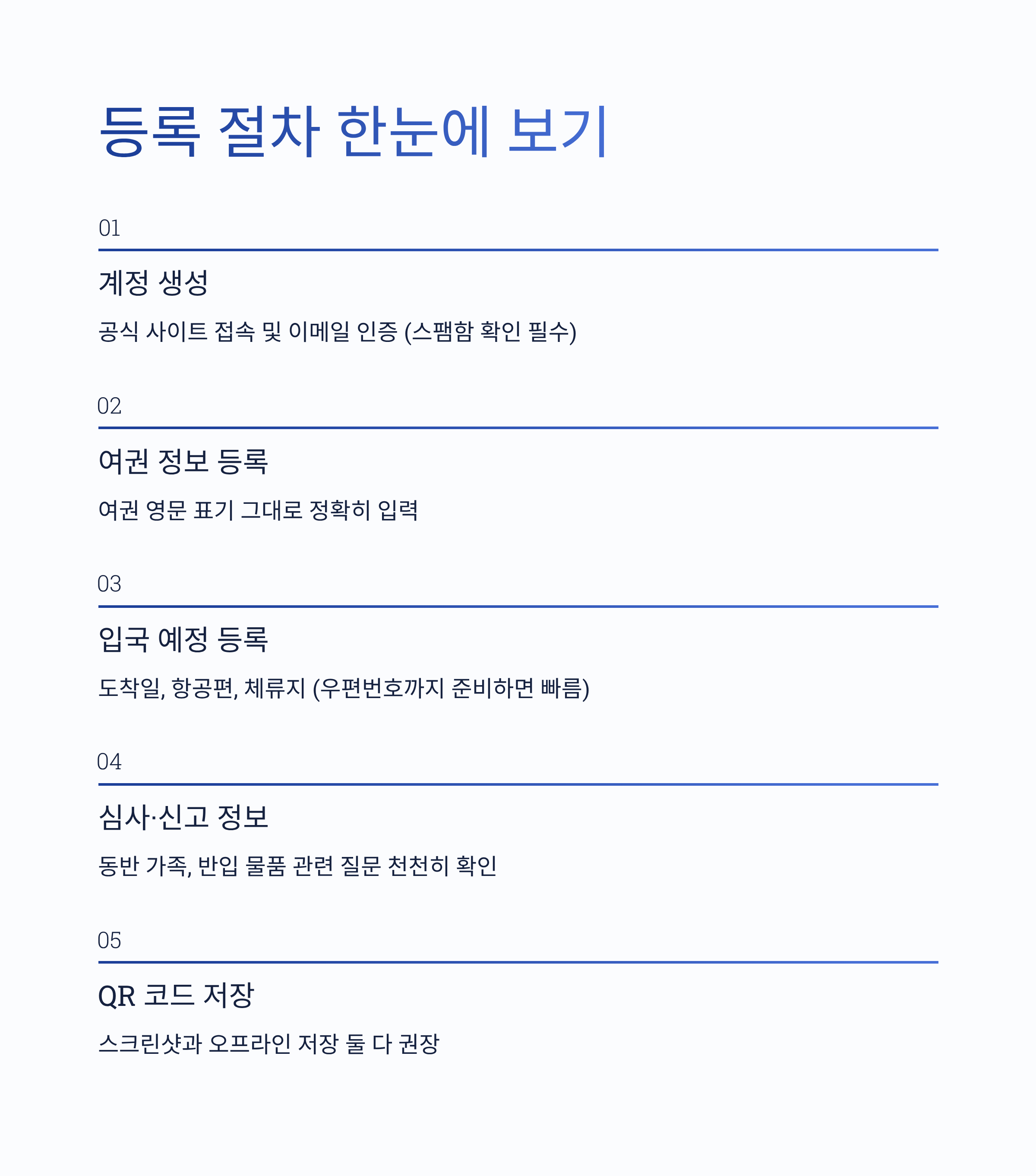 | 3 | 입국 예정 등록: 도착일, 항공편, 체류지 | 숙소 주소는 정확히, 우편번호까지 준비하면 빠름 |