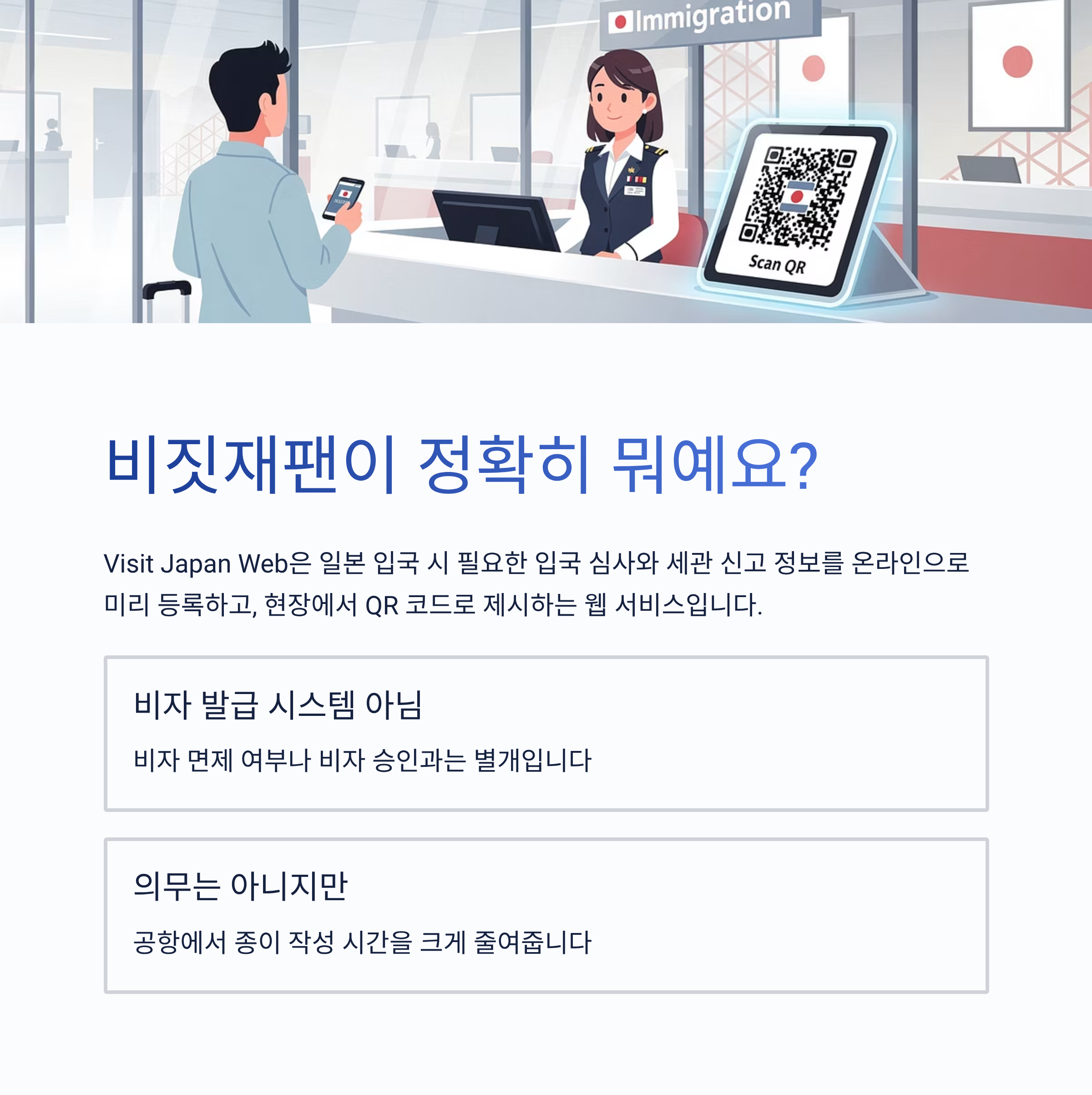 Visit Japan Web은 일본 입국 시 필요한 절차 중 입국 심사와 세관 신고 등에 필요한 정보를 온라인으로 미리 등록하고, 현장에서 QR 코드로 제시할 수 있게 해주는 웹 서비스입니다. 비자 발급 자체를 처리해 주는 시스템은 아니므로, 비자 면제 여부나 비자 승인과는 별개로 이해하는 것이 안전합니다.