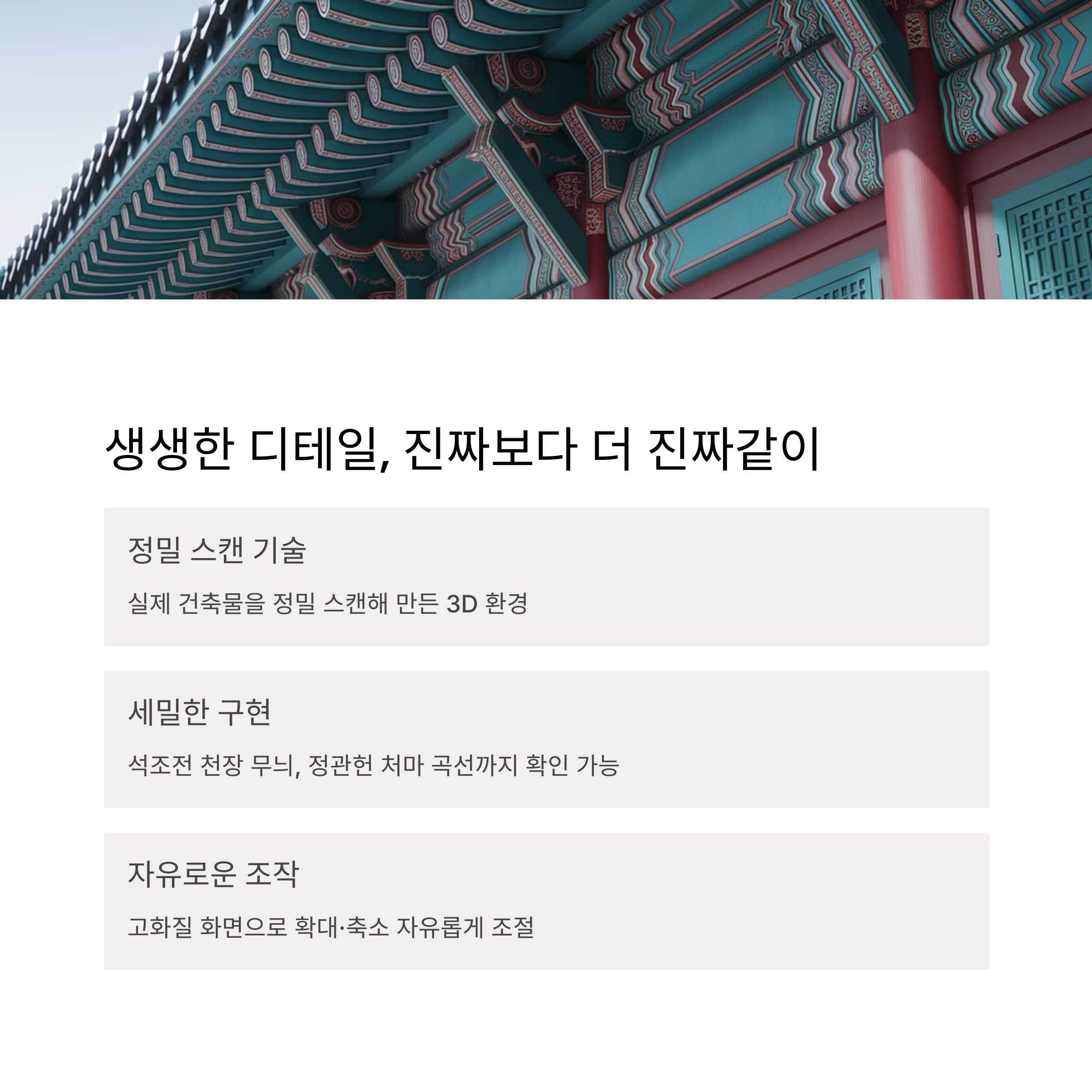 단순 사진이 아니라 실제 건축물을 정밀 스캔해 만든 3D 환경이라 작은 장식까지도 구현도가 놀라워요. 석조전 천장의 무늬, 정관헌의 처마 곡선까지 눈으로 자세히 확인할 수 있습니다.
