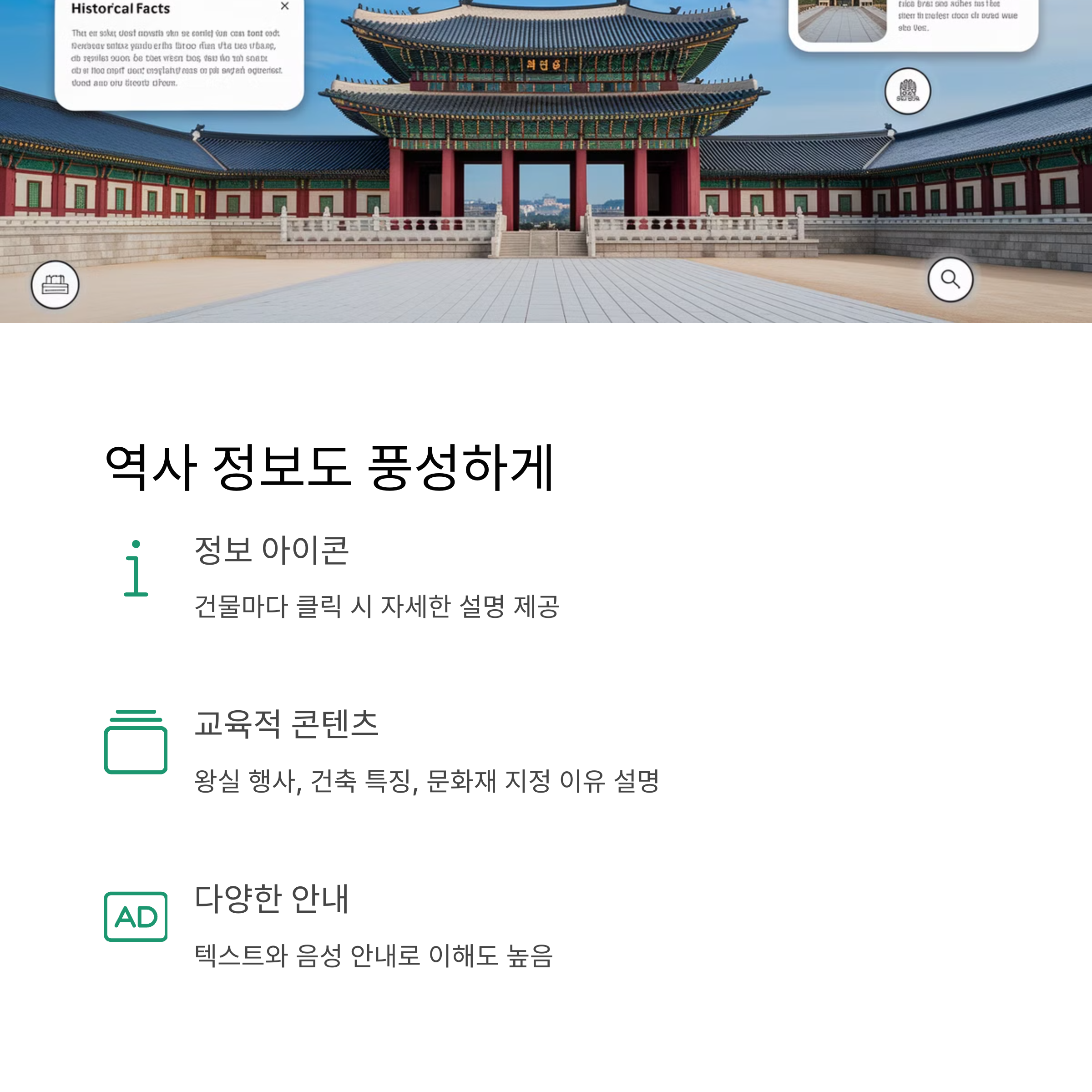 단순한 관람이 아닌, 각 건물 앞에 정보 아이콘이 있어 클릭 시 자세한 설명을 확인할 수 있어요. 주요 왕실 행사, 건축 특징, 문화재 지정 이유 등 교육적인 요소도 충실합니다.
