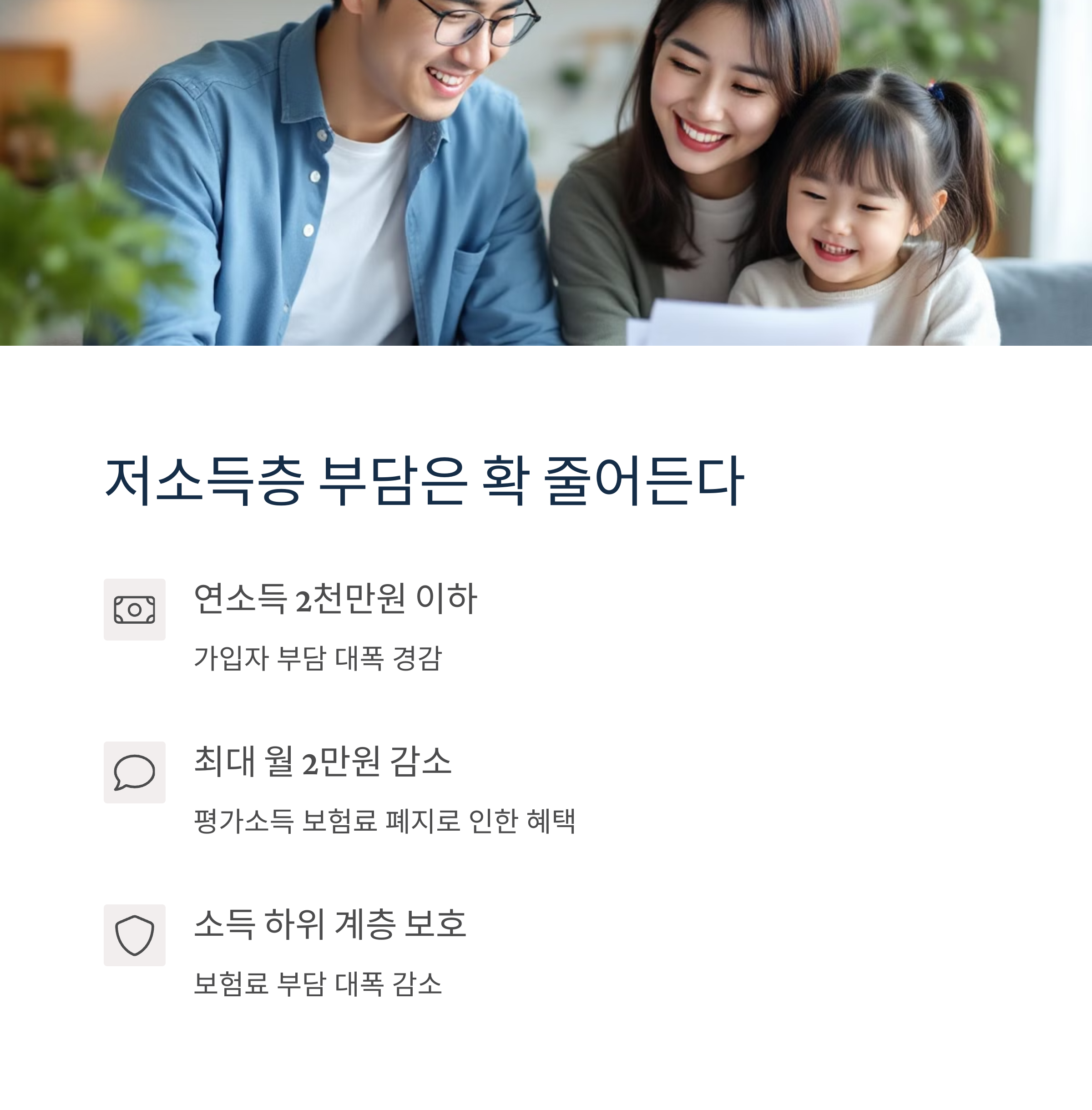 연 소득 2천만 원 이하 지역가입자의 보험료 부담이 낮아집니다.