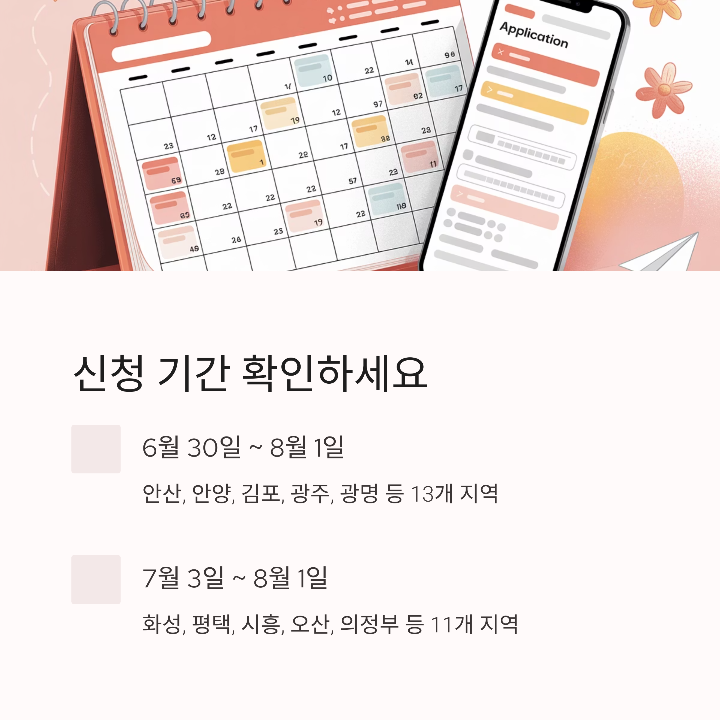 ✔️ 2025년 6월 30일 ~ 8월 1일 : 안산, 안양, 김포, 광주, 광명, 하남, 군포, 이천, 안성, 의왕, 양평, 여주, 과천