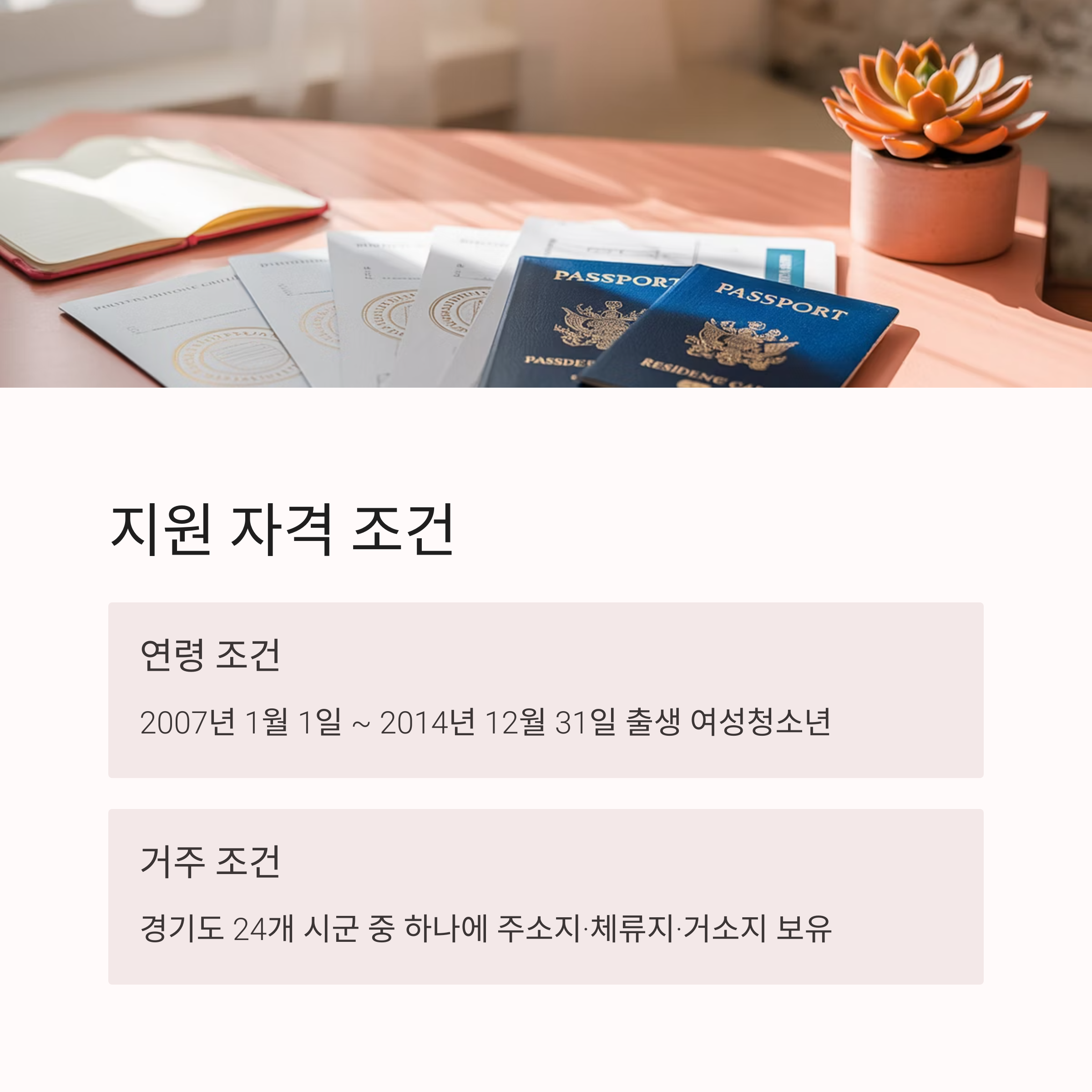 ㅇ 신청대상<br /> - 아래 「자격기준」과 「연령기준」을 모두 충족하는 여성청소년<br /> 가. 자격기준 : 사업 참여 24개 시·군 내 주소지·체류지·거소지를 둔 여성청소년<br />