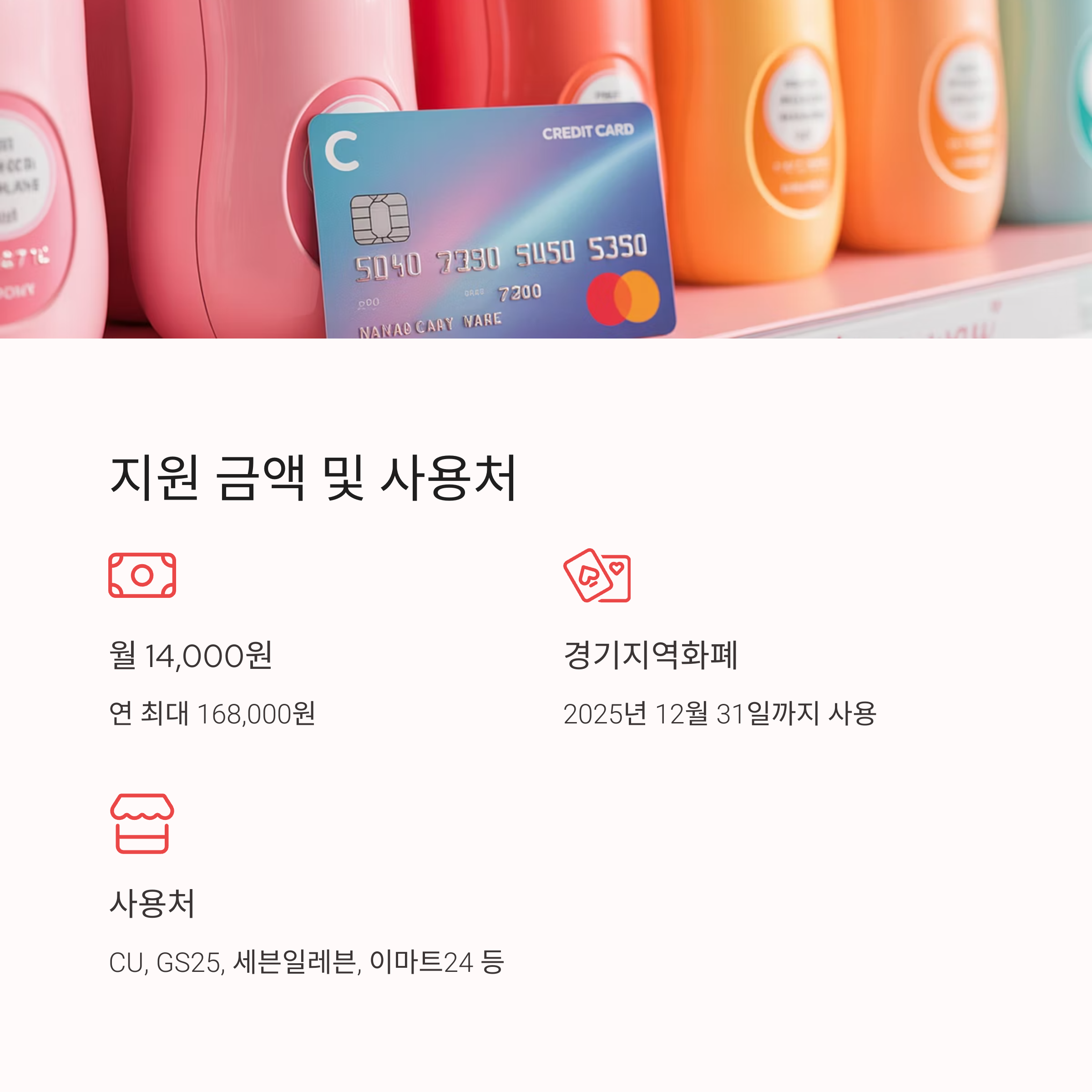 매달 14,000원이 경기지역화폐로 지급됩니다. 연 최대 168,000원까지!