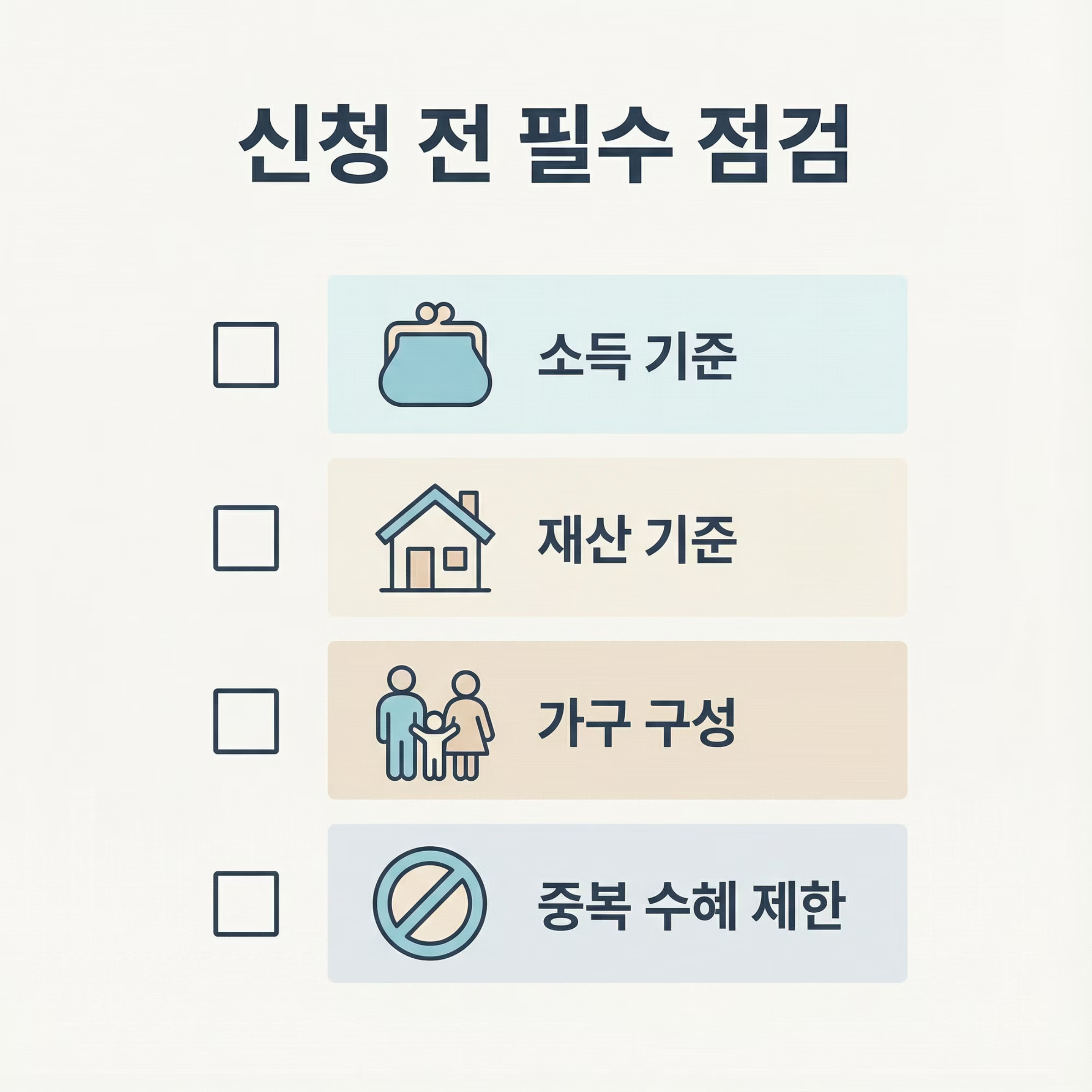 신청 전에는 소득·재산뿐 아니라 가구 구성 변화(혼인, 분가, 동거 등)도 같이 점검해두면 실수를 줄일 수 있습니다.