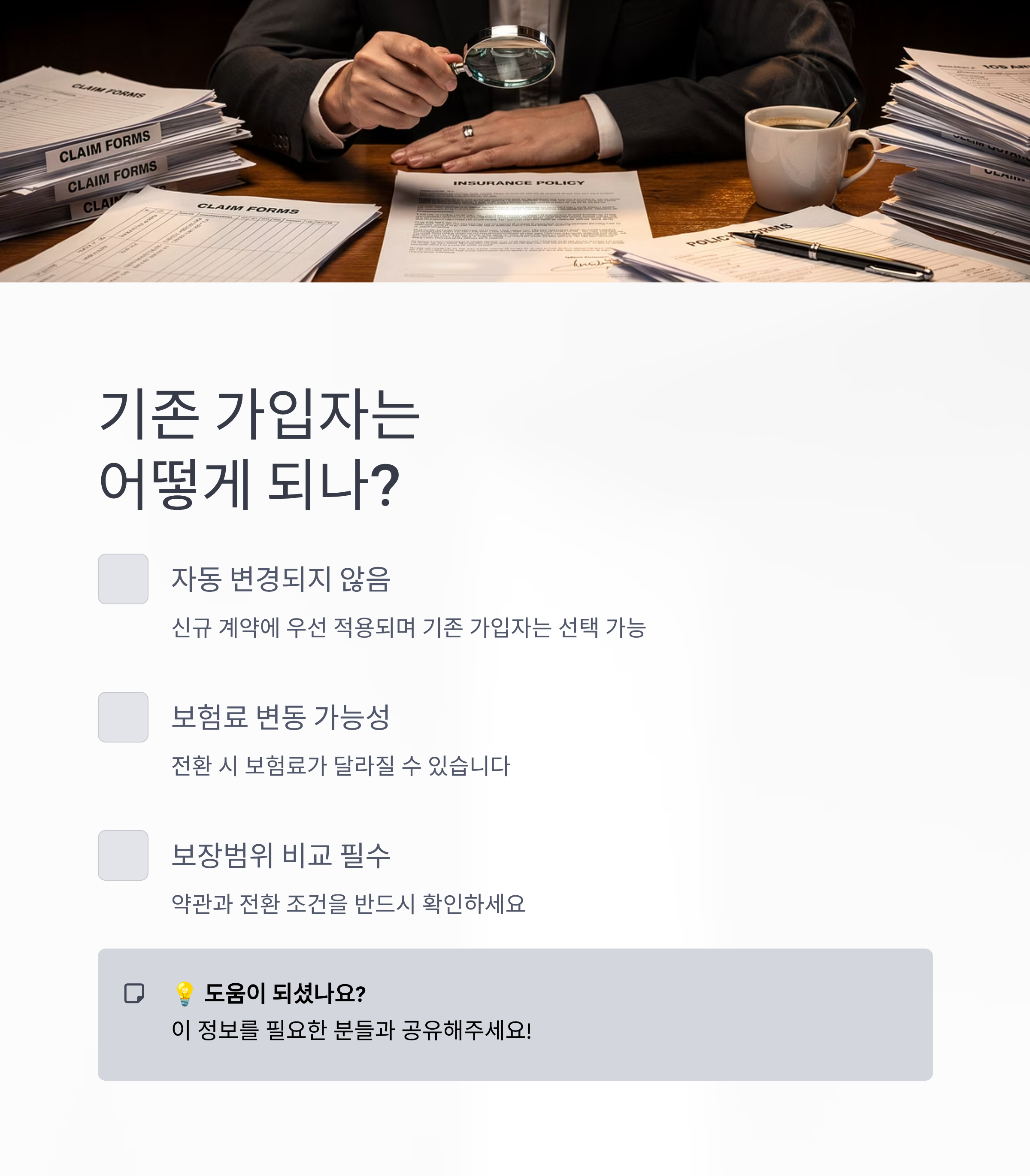 2026 개정은 신규 계약에 우선 적용되며 기존 가입자는 선택적으로 전환하거나 그대로 유지할 수 있습니다. 다만, 일부 보험사는 개정 이후 판매되는 상품만 전환 가능하도록 운영하기 때문에 반드시 약관과 전환 조건을 확인해야 합니다.