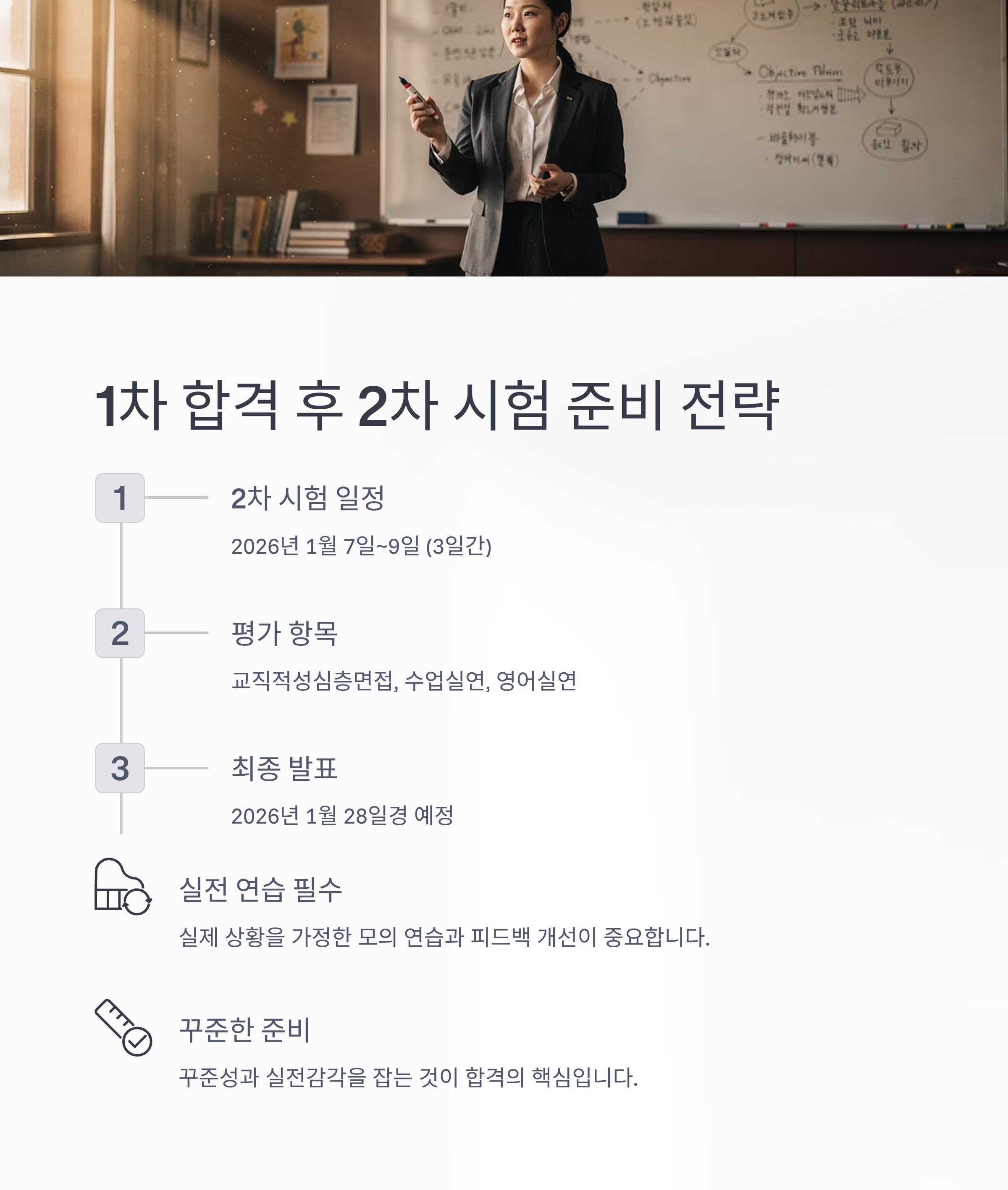 2차 시험은 2026년 1월 7일부터 9일까지 총 3일간 진행될 예정입니다. 교직적성심층면접, 수업실연, 영어실연 등이 포함되어 교사의 실무 능력과 사고력을 종합적으로 평가하는 과정입니다. 특히 단순 암기형 시험이 아닌 만큼 실제 상황을 가정한 모의 연습이 필수이며, 피드백을 통한 개선 과정이 중요합니다.