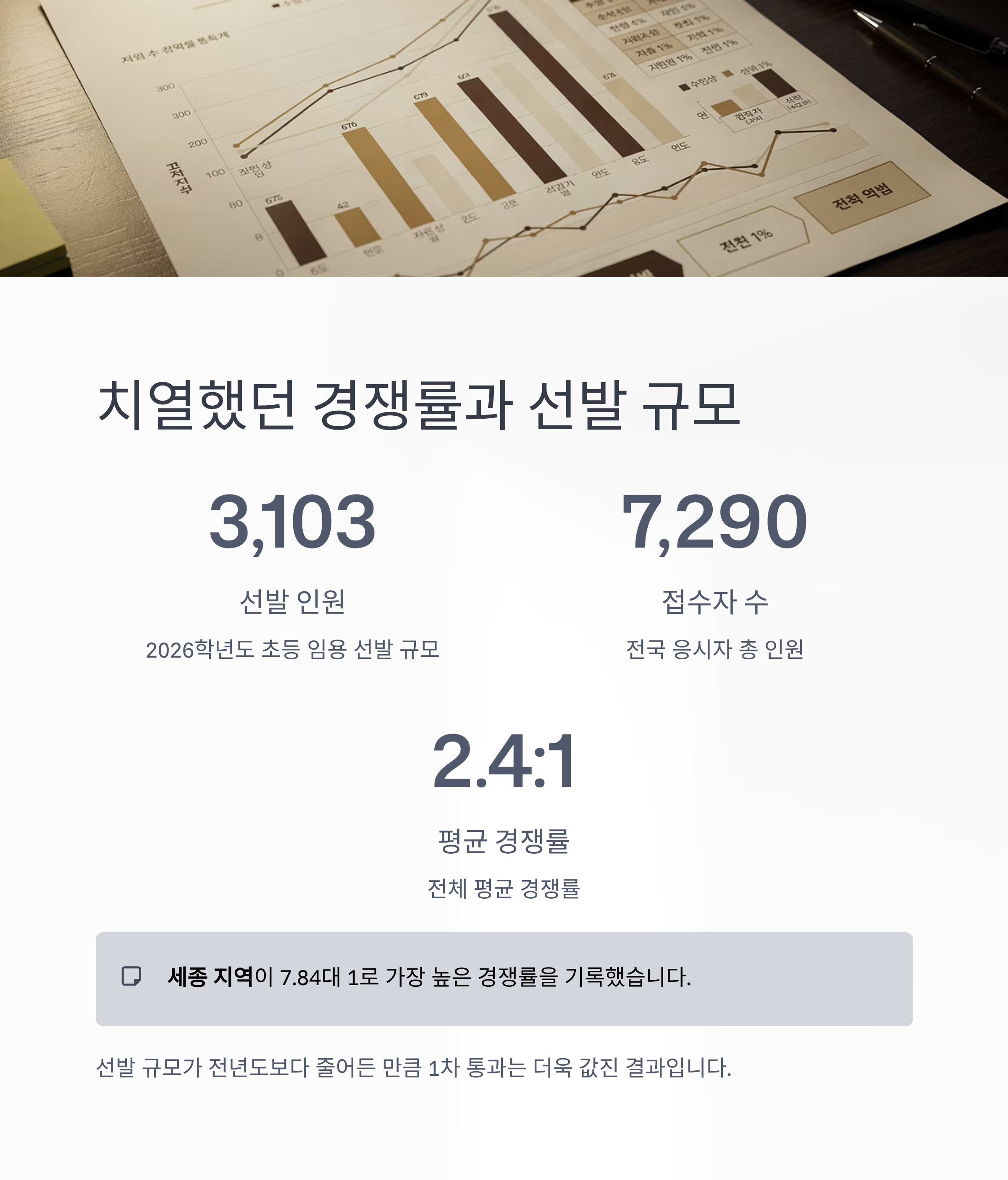 2026학년도 초등 임용 선발인원은 약 3,103명, 접수자는 7,290명으로 공식 발표되었습니다. 이를 기준으로 전체 평균 경쟁률은 약 2.4대 1로 집계되며, 지역별로는 세종이 7.84대 1로 가장 높은 경쟁률을 기록해 큰 관심을 모았습니다. 선발 규모가 전년도보다 줄어든 만큼 경쟁이 치열해질 것이란 예측이 있었고 실제로 일부 지역에서는 높은 난도가 확인되었습니다.