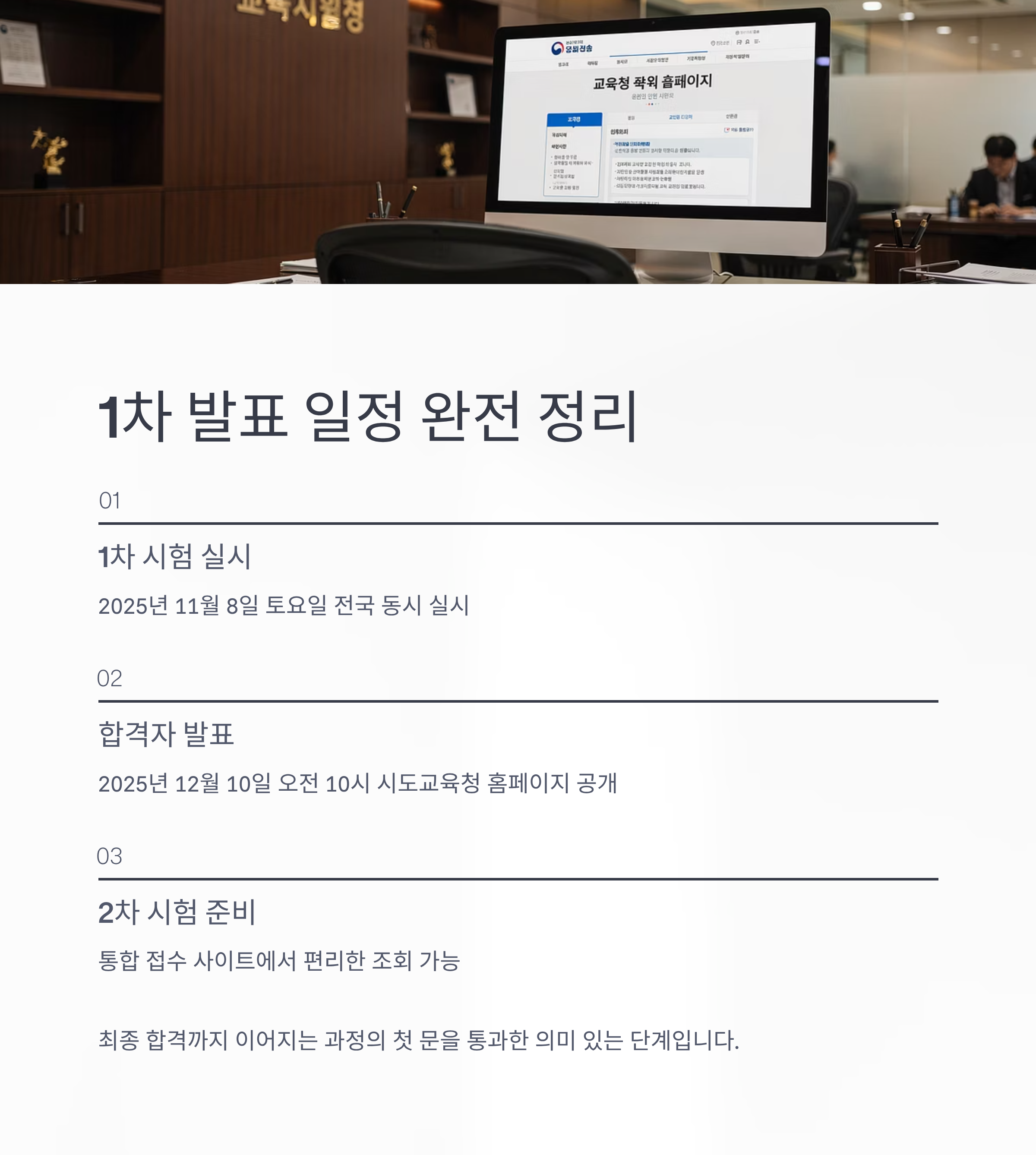 2026학년도 초등 임용시험 1차는 2025년 11월 8일 토요일에 전국적으로 실시되었습니다. 이후 예비 선생님들이 손꼽아 기다리던 1차 합격자 발표는 2025년 12월 10일 오전 10시 정각, 시도교육청 홈페이지를 통해 일제히 안내되었습니다. 특히 교원임용시험 통합 접수 사이트에서도 조회가 가능해 많은 응시자가 보다 편리하게 정보를 확인할 수 있었습니다.